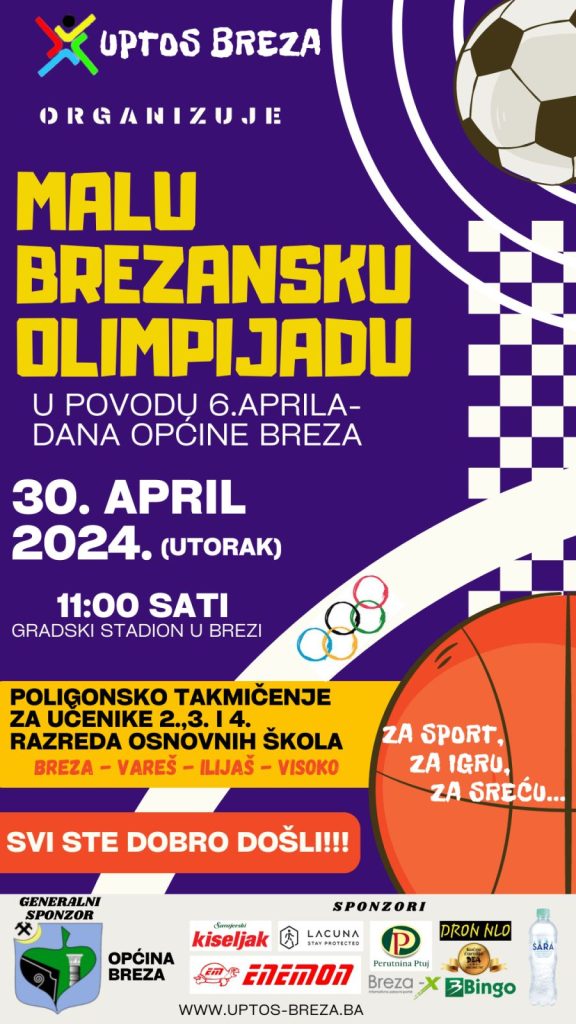 30.04. 2024. godine na Gradskom stadionu u Brezi održati će prva Mala brezanska olimpijada. Sportsko poligonsko takmičenje u povodu 6.aprila-Dana općine Breza. Takmičiti će se učenici drugi, trećih i četvrti razreda osnovnih škola iz Breze, Vareša, Ilijaša i Visokog. Takmičenje počinje u 11:00 sati.